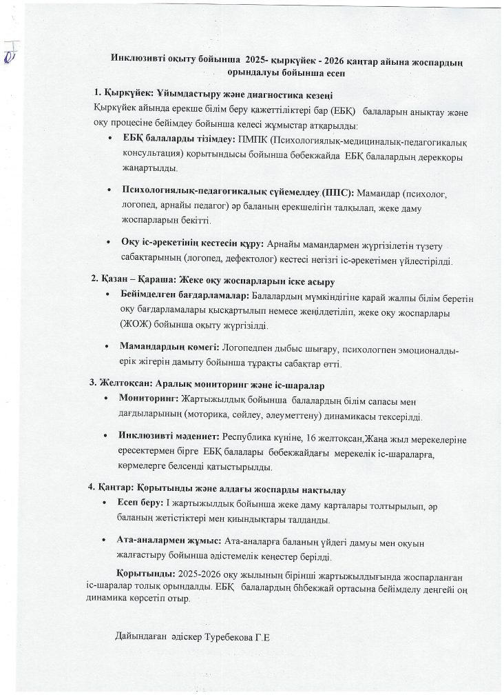 Инклюзивті оқыту бойынша 2025- қыркүйек - 2026 қаңтар айына жоспардың орындалуы бойынша есеп