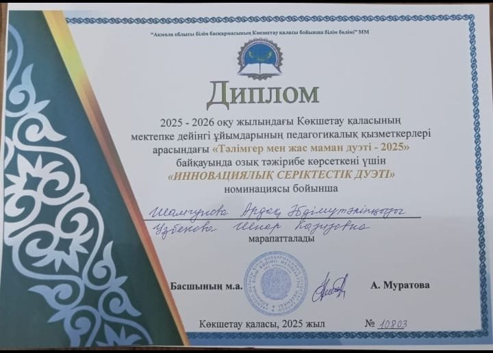 2025 жылғы 11 қарашада Көкшетау қаласының «Мирас» бөбекжайы базасында мектепке дейінгі ұйымдар педагогтерінің қызметкерлері арасында «Тәлімгер мен жас маман дуэті – 2025» қалалық байқауы өтті.